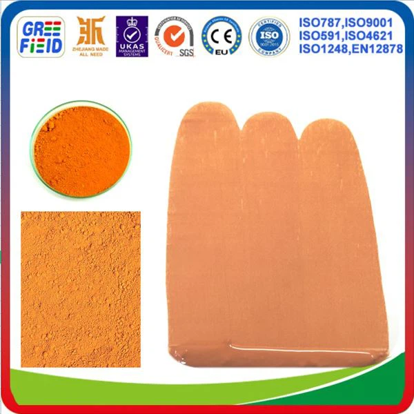 Unser GREEFIELD®Hochleistungspigmente aus synthetischem Eisenoxid verfügen über die komplette Farbpalette von Eisenoxidrot, Oxidgelb, Oxidschwarz, Oxidorange, Oxidbraun und Compound Ferric Green, Compound Ferric Blue, die eine ausgezeichnete Farbkonsistenz und Dispergierbarkeit sowie eine starke Farbstärke aufweisen kann in vielen Bereichen eingesetzt werden, z. B. als Farbstoff in der Farben- und Beschichtungsindustrie, im Baugewerbe, in der Farbasphaltbitumenindustrie, in der Keramikindustrie, in der Kunststoff- und Gummiindustrie, in der Papierindustrie, in der Floatglasindustrie und als Mulchfarbstoff im Innen- und Außenbereich usw.